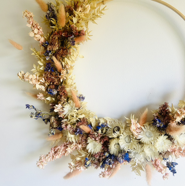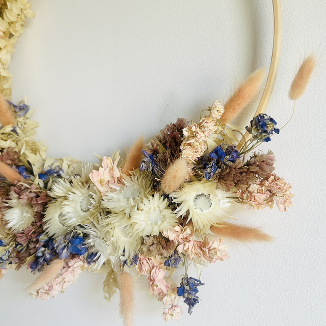 A peachy, pinky, cream with a hint of blue dried and preserved wreath. suitable for indoors or a sheltered porch.