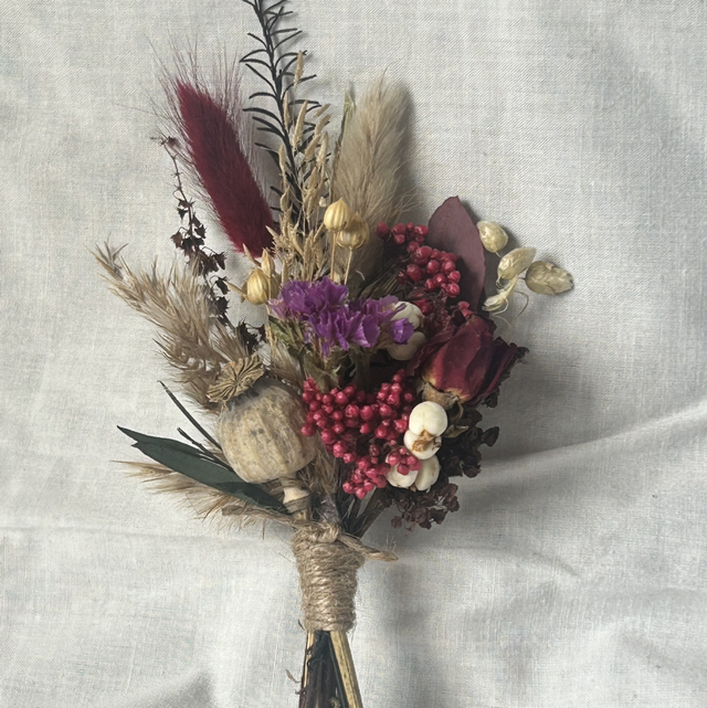 Our Buttonholes are beautiful sprigs of dried flowers & foliages lovingly bound together with twine, the corsages are slightly bigger and have an extra ribbon attached , both ready just to pin onto your outfit.