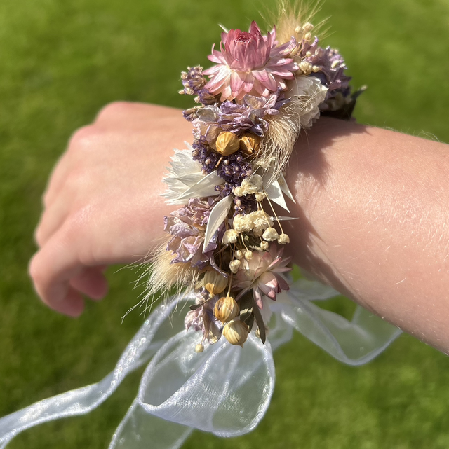 Wristlets are dried florals bound onto a small wire & finished off with a ribbon to secure to your wrist.