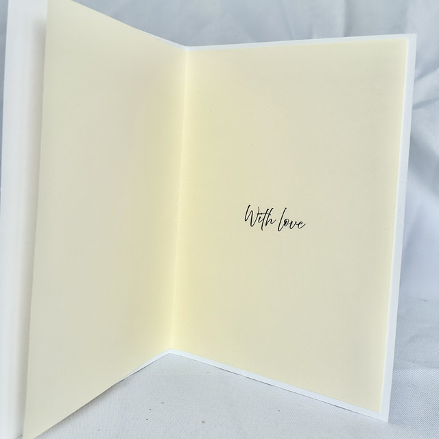 The cards are made from white hammered thick card with an ivory insert, with the wording ‘with love’ on the inside. They will come delivered in a box with tissue and a care card.