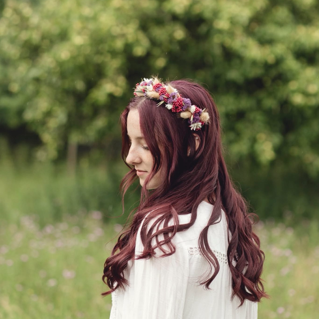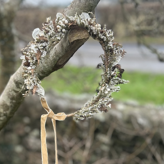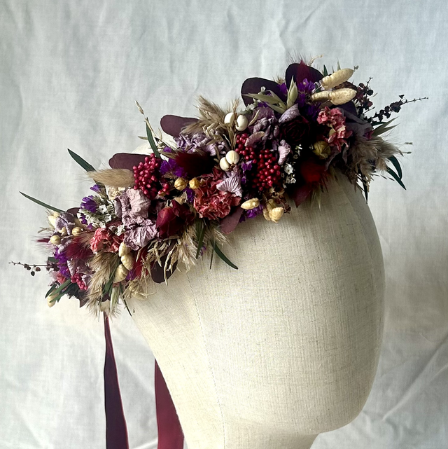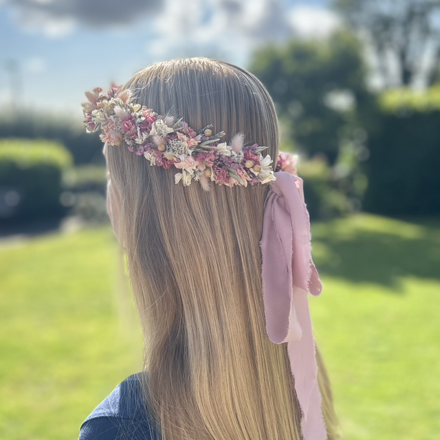 Crowns come in adult & child sizes in a colour way of your choice. All the florals are carefully arranged & bound onto a metal circlet and finished with a ribbon matching your colour choice. The crowns are easily adjustable by loosening or tightening the ribbons.