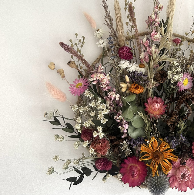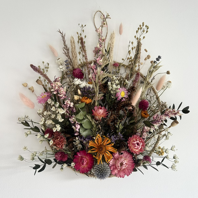 Featuring : wire attached to a metal hoop and bound in twine to secure. Delphiniums, globe thistle, grasses, hellichrysums, acrocliniums, amaranth, bunny tails, limonium, enchinacea, mini poppy seed heads, briza maxima, fern, oats, ammi, coreopsis.