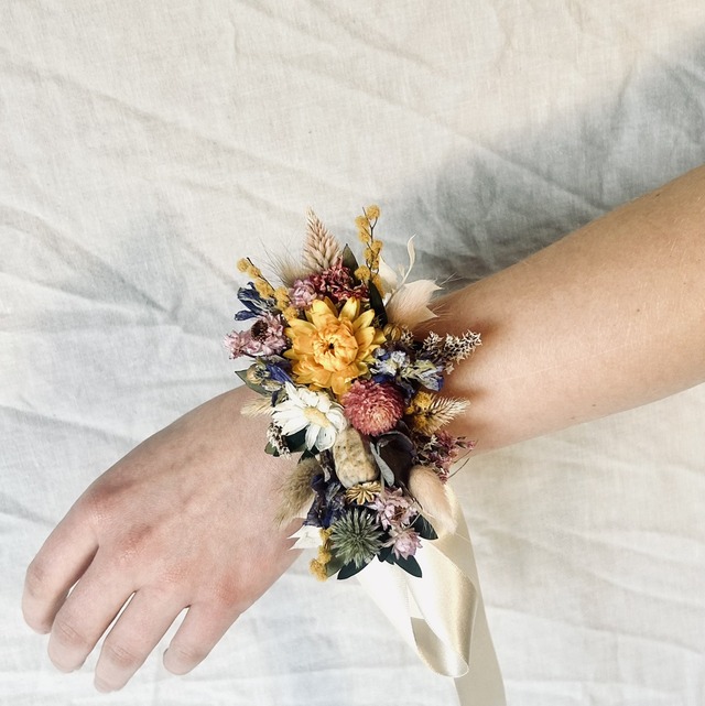 A beautiful country style colour mix of dried florals on a silk ribbon. An elegant wrist corsage that could be worn by a bride, bridesmaid or wedding guests & the colour way would match a multitude of outfit colours or choices.