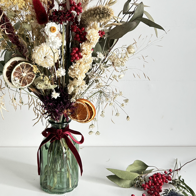 A festive mix of dried flowers and foliages, including dried fruits, berries & feathers all arranged in a bottle green ribbed vase & finished with a sumptuous burgundy velvet ribbon. The perfect addition to a festive table or sideboard.
