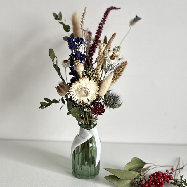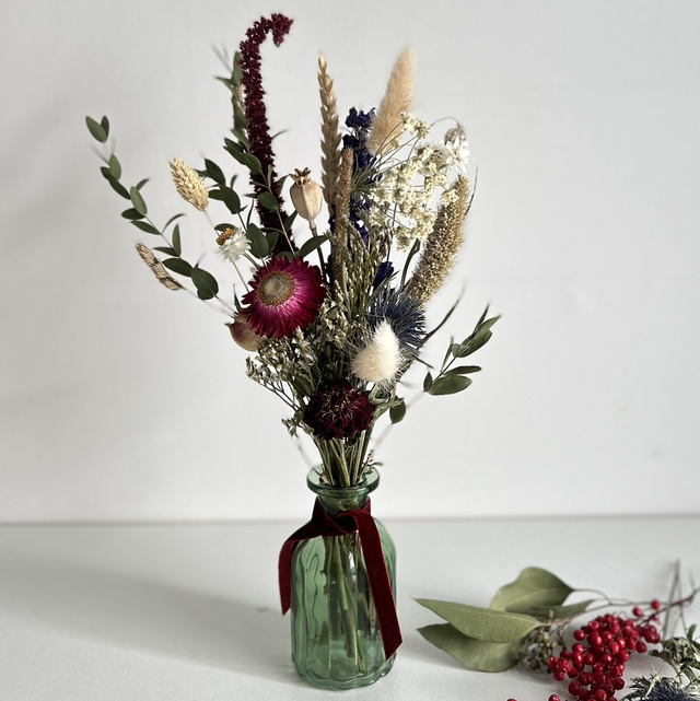 Add a touch of dried flower luxury to your Christmas table, sideboard or shelf this year with these gorgeous little festive bud vases. A mix of festive florals all arranged in a ribbed bottle green bud vase, finished with a little velvet ribbon.