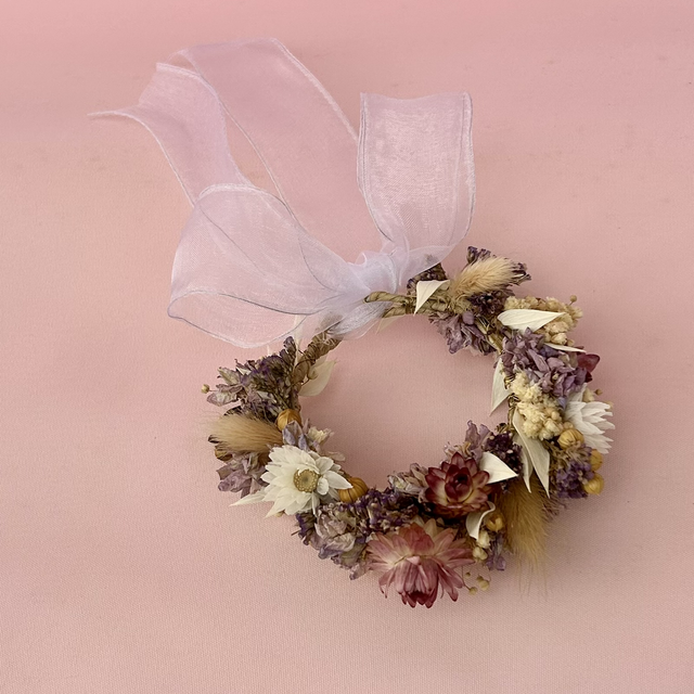Dried and preserved wrist corsage in pinks, blues and cream. Featuring pink helichrysum, blue delphinium, linum, bunny tails, limonium, ruscus and daisiesTied with a white organza ribbon.