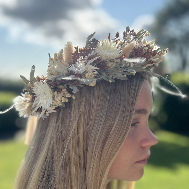 Boho style dried and preserved floral crown. Featuring eucalyptus, ruscus, fern, bunny tails, daisies, Linus, grasses, helichrysum, gypsophillia, nigella seed pods and tied with a cream satin ribbon.