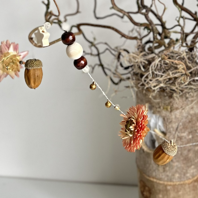 A lovingly bespoke handmade garland of strawflowers, acorns, beads & bells on a gold wire to adorn a shelf, a fireplace mantelpiece or a wall.