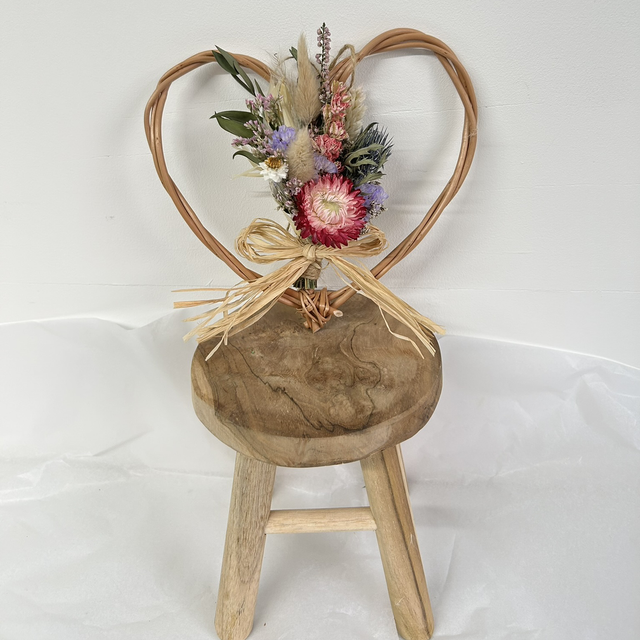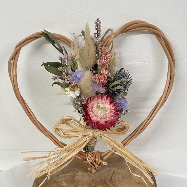 A thin hand woven buff willow heart adorned with natural dried flowers bound on with twine, finished with a natural raffia bow.