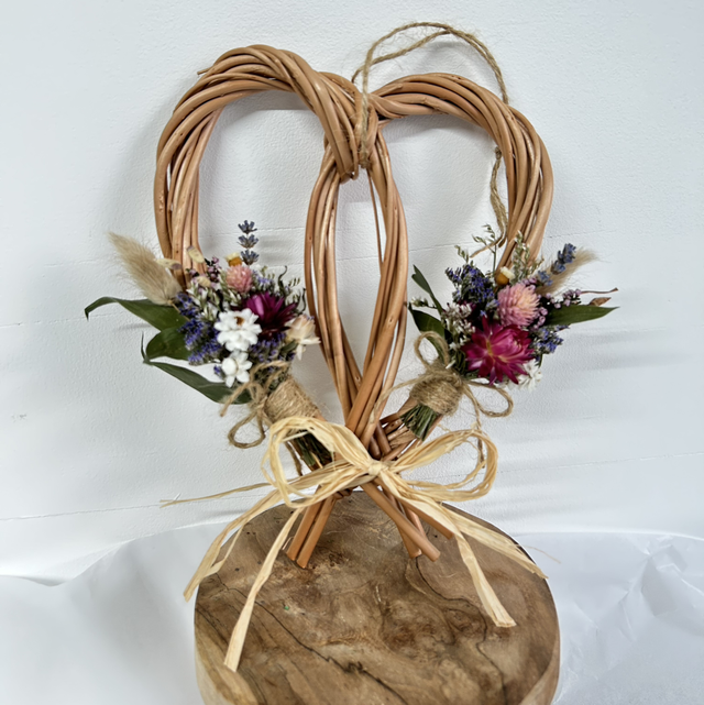 A bespoke hand woven buff willow heart adorned with natural dried flowers bound on with twine, finished with a natural raffia bow.
